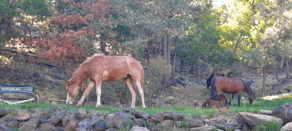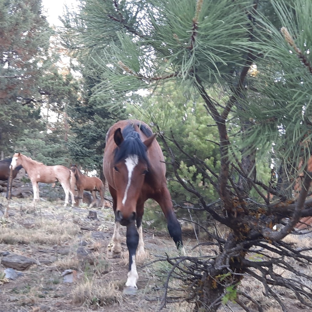 My first sight of the bay stallion’s Ruidoso herd had me breathless. As they were at the entrance of the mountain cabin community where we had our Air BnB, I got out of the car, assured my family they could go on without me when they were ready, and settled in to observe.