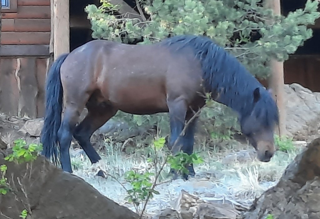 When they moved away toward our cabin, I chose a route that took me close to them but not directly in their path. I paused a few yards away, watching. A roan foal and a bay foal paired up to come closer to me – clearly expecting me to give them something. I reached out my hand and they nuzzled my palm, both of them – and a third foal that crept up during the encounter.