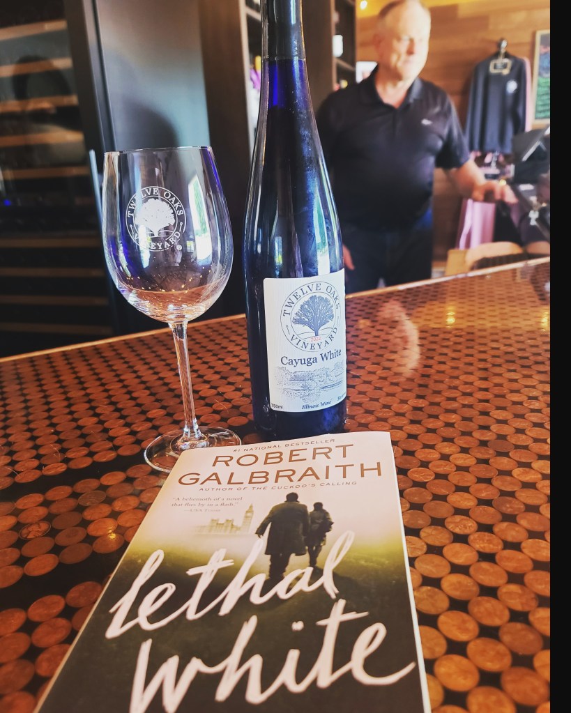At Twelve Oaks Vineyard, I had a flight because I couldn’t decide. Since I was reading Lethal White by Robert Galbraith / J.K. Rowling, I snapped a shot with a bottle of their Cayuga White. I love Cormoran Strike and Robin Ellacott, and Galbraith tells a good story. I’m usually in suspense all the way to the end. I’m becoming impatient with the love interest side of things—either get them together or have them address why it won’t work (if it wouldn’t work). Still, I’m invested in the characters so I’ll ride out the series.