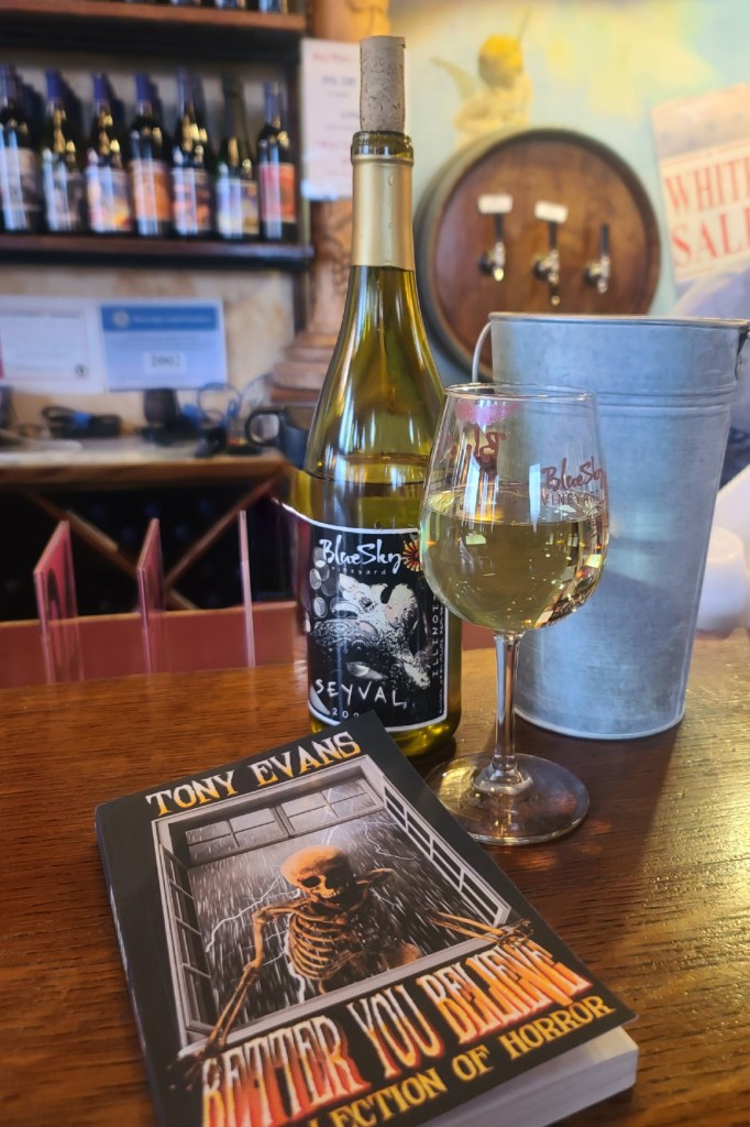 I started reading this one at Blue Sky Vineyard, where my wine of choice that day was Seyval.